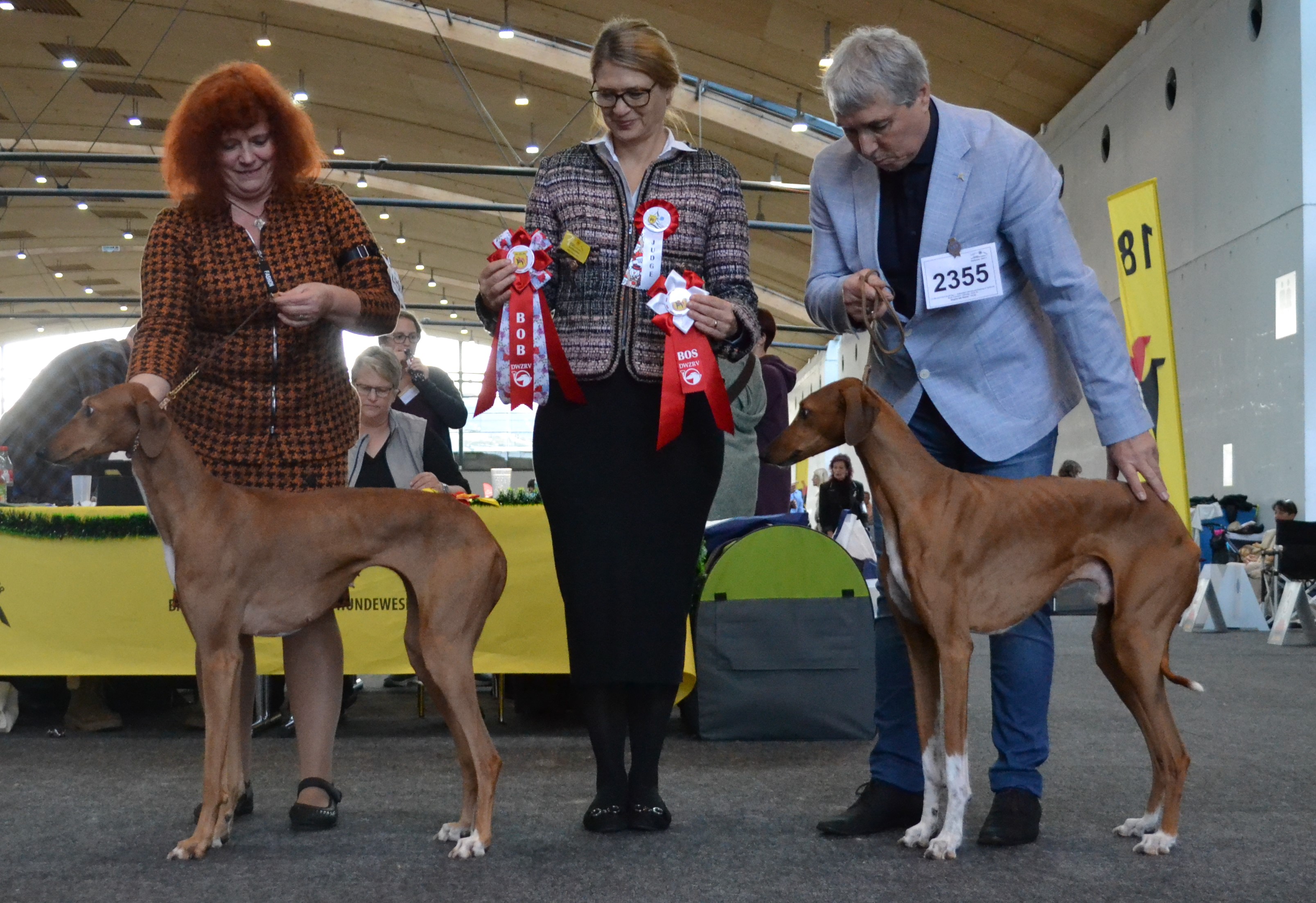 Obrovské poděkování patří všem rozhodčím. Plemeno Azawakh posuzovala paní Zdenka Jílková s maximální ohleduplností na plemeno a moc děkuji za krásné posudky. V závěrečných soutěžích veterány vybírala paní Olga Dolejšová a Didi (Eidi n´Amanar Hadiya) ve svých 10,5 letech pro ni byla tím nejkrásnějším veteránam. A závěr, to nej... z výstavy - BIS - pečlivě rozhodoval a vybíral pan Antonín Mudra.