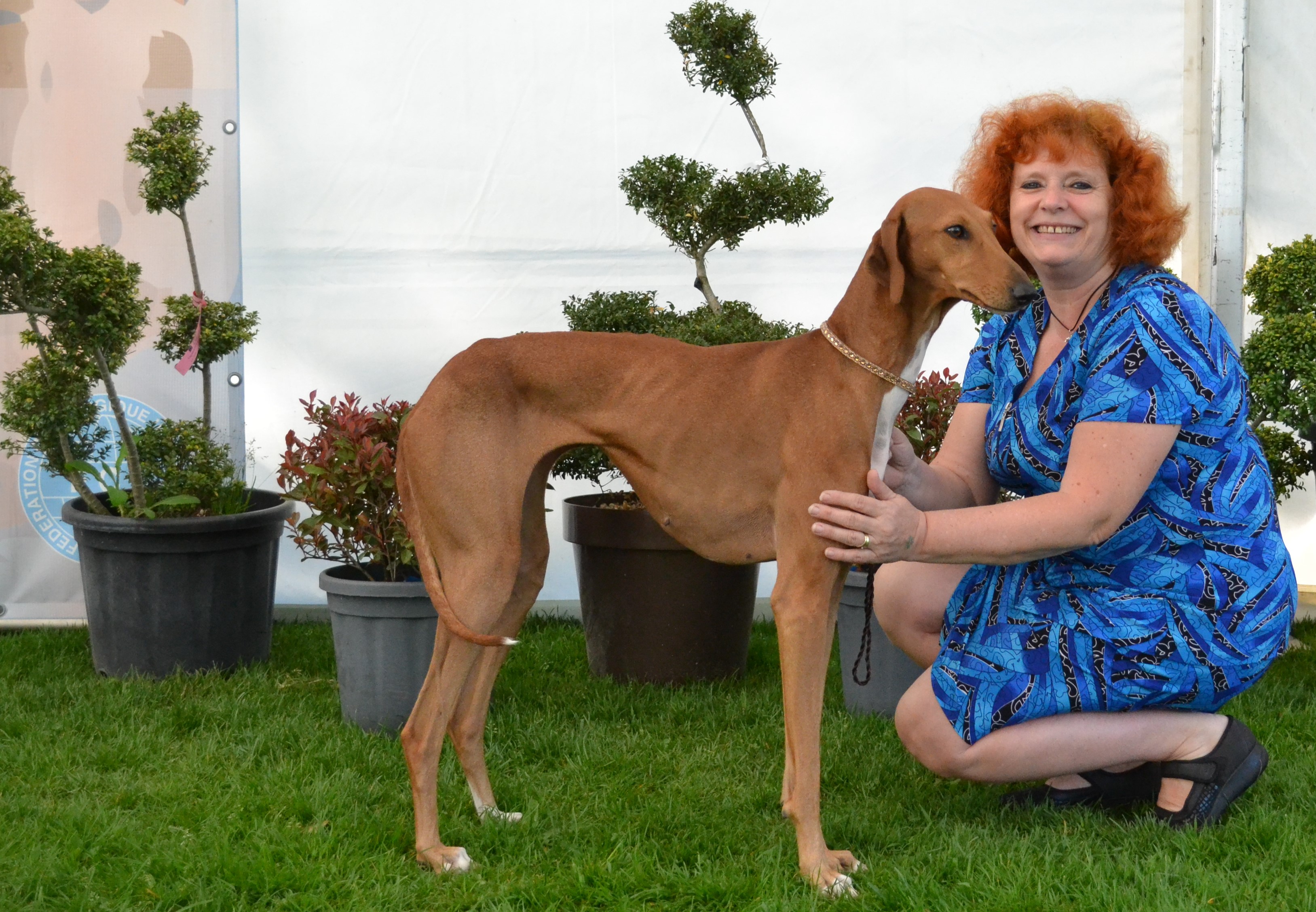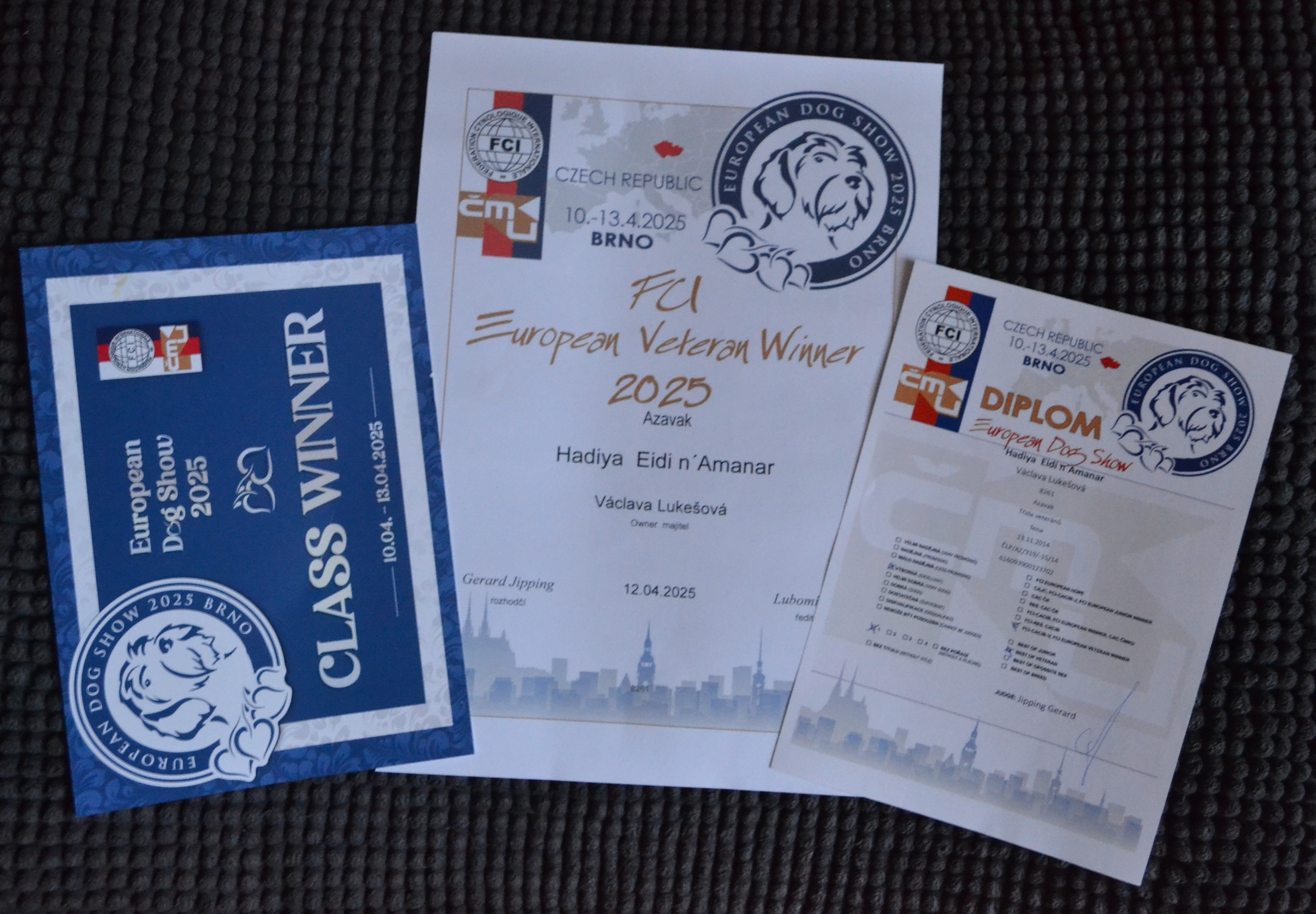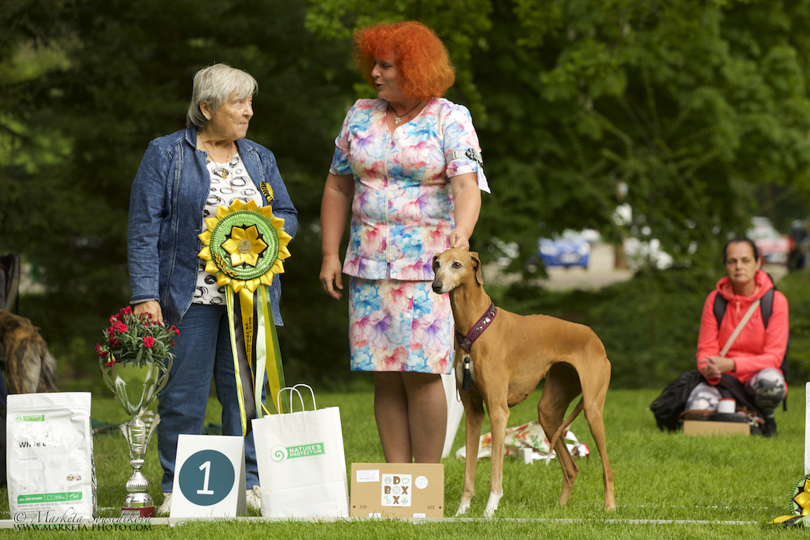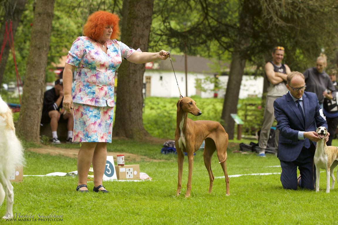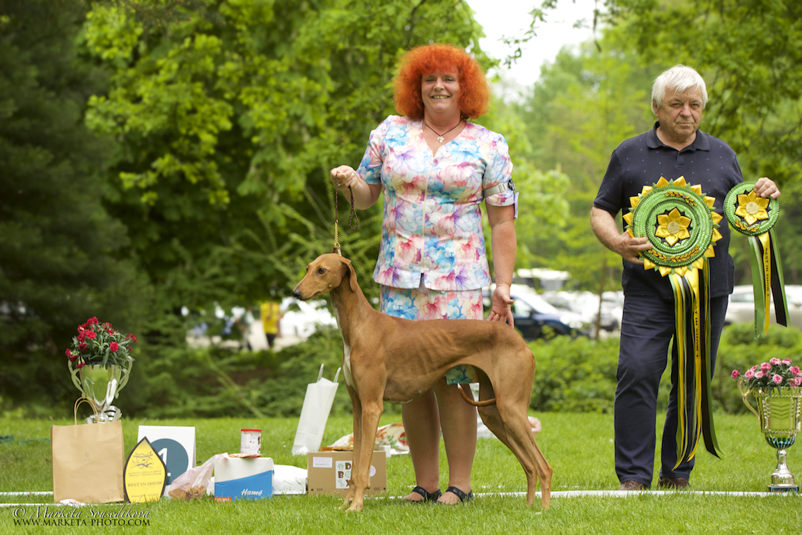 Obrovské poděkování patří všem rozhodčím. Plemeno Azawakh posuzovala paní Zdenka Jílková s maximální ohleduplností na plemeno a moc děkuji za krásné posudky. V závěrečných soutěžích veterány vybírala paní Olga Dolejšová a Didi (Eidi n´Amanar Hadiya) ve svých 10,5 letech pro ni byla tím nejkrásnějším veteránam. A závěr, to nej... z výstavy - BIS - pečlivě rozhodoval a vybíral pan Antonín Mudra.
